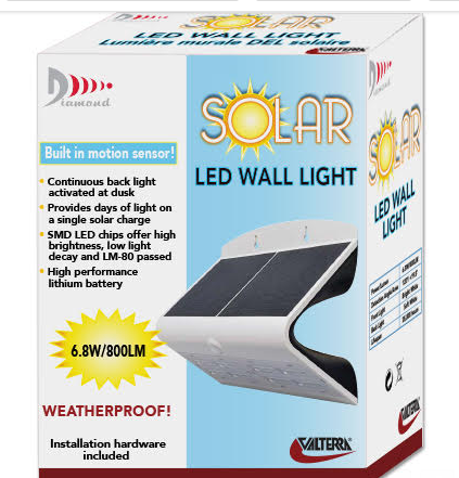 This outdoor solar powered porch light is 6.8W and 800 Lumens. This light is weatherproof and has a lithium battery. Use this outdoor light on the outside of your RV and campsite. It will provide you with lighting, safety and security. When fully charged it will stay on all night. It has a motion sensor from dim to bright. No wiring is required, takes only a minute of your time to install and includes the hardware you need.