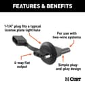This electrical adapter is designed to adapt a 4-way flat vehicle socket to fit into a 1-1/4" license plate light hole, providing a convenient attachment point for your trailer wiring plug. It features quality plastic construction, requires no splicing and comes with a dust cover, protecting the socket from dirt, water and road grime. All CURT wiring and electrical products come with a one-year limited warranty to give you the assurance you need to tow with confidence.