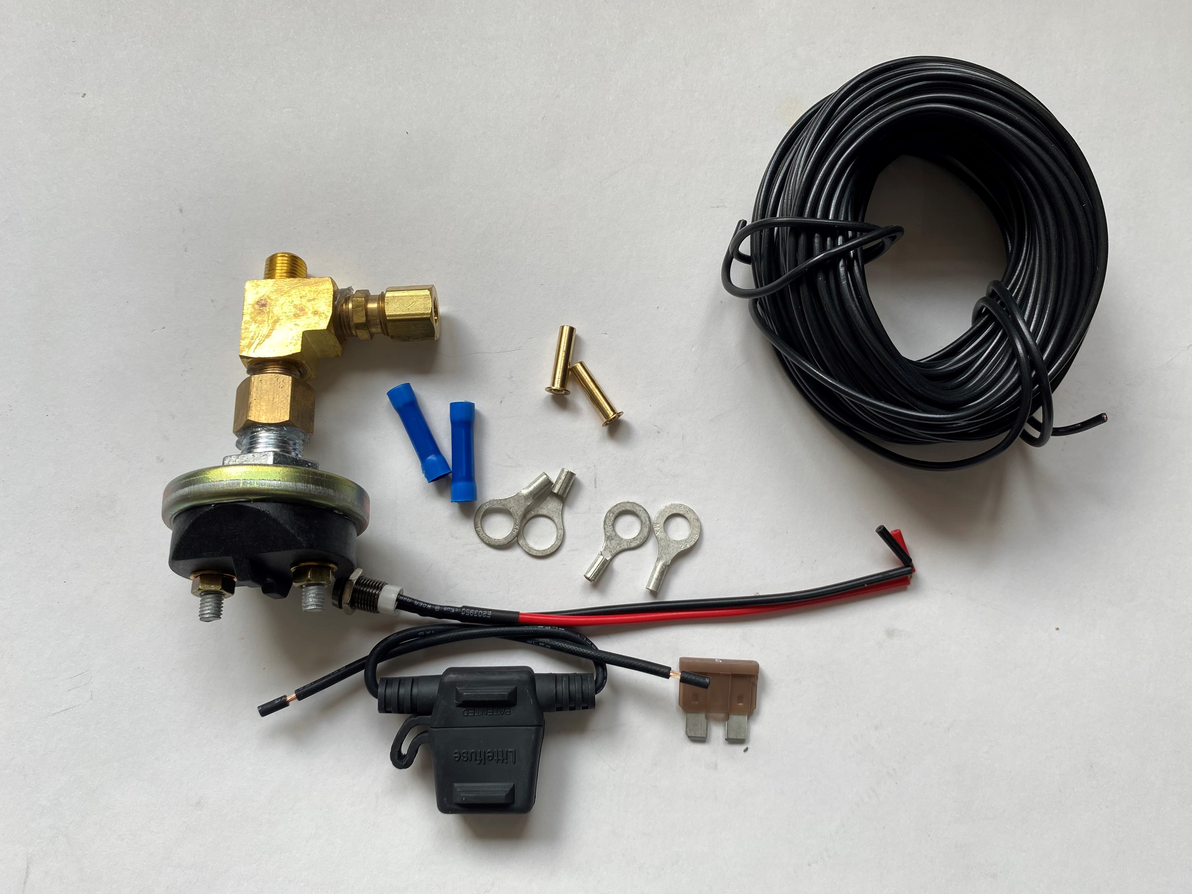 The M&G Alert LED Kit consists of one pressure switch, one tee and reducer, 50 ft. black 16 gauge wire, one red led, wire connectors, and 5 amp fuse.