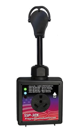 The Smart Surge RV surge protector offers 3-mode, 270 joule protection, with surge indicator denoting condition of surge protector. Built in circuit analyzer checks AC outlet for proper wiring condition. Fully automatic, no reset buttons, or nuisance tripping problems. 120V/30A rating.