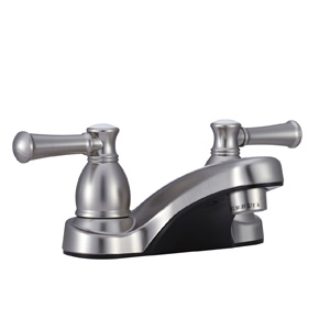 Lavatory Faucet; Single Piece 4 Inch Deck Mount; 2 Lever Designer Handle; Brushed Satin Nickel Plated/ Plastic