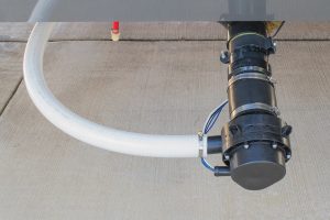 The system includes the powerful macerating pump, an on-off switch, a 21' extendable hose and universal nozzle. While the pump is permanently installed on the sewer outlet, the hose and nozzle are easily stored in a compartment or in the optional storage box.