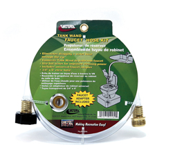Eliminates the need to drag your garden hose through your RV. Use between your bathroom sink faucet and tank wand. Use hot water for improved cleaning. Includes: 3/4" x 6' clear hose with easy to use gripper and universal faucet adapter.