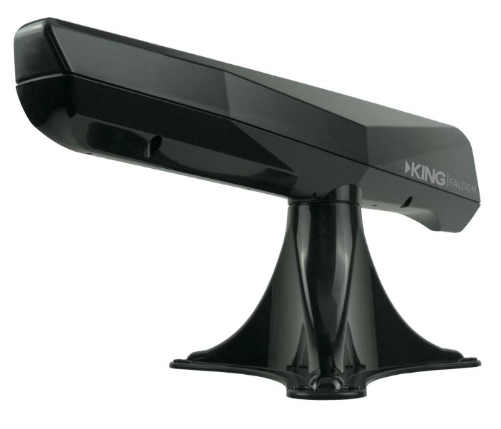 The KING Falcon Stationary Automatic Directional Wi-Fi Antenna increases the range and performance of the included KING WiFiMax Router/Range Extender, making this package the ideal combination for those who want to get the most out of their mobile Wi-Fi experience. The Falcon, a powerful, outdoor, automatic, directional 2.4GHz Wi-Fi antenna mounted to your roof, automatically scans for available networks and then aims itself at the selected network. Allowing the WiFiMax to connect to networks from farther away and increasing speeds at all ranges. With an antenna that is up to 10x more powerful than the competition, the KING Falcon takes advantage of the increased power and performance of a directional Wi-Fi antenna, without the traditional hassle of needing to aim the antenna. The free KING Wi-Fi App on your smartphone or tablet ensures setup and aiming will be a breeze.
