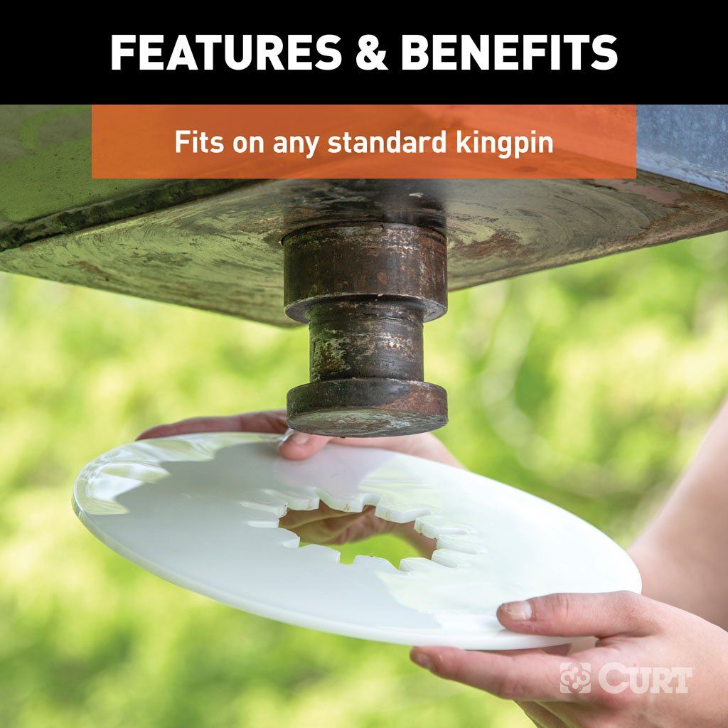 Provides a buffer between a 5th wheel hitch head plate and kingpin pin box