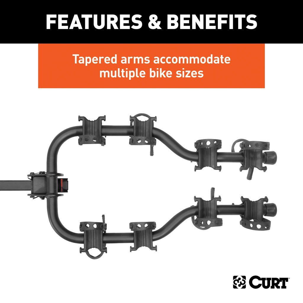 Tapered arms accommodate multiple bike sizes, including kids' bikes