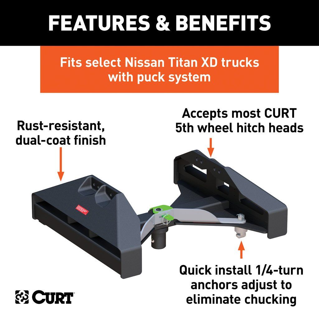 Adapts most CURT 5th wheel hitch heads to fit the Nissan Titan XD puck system