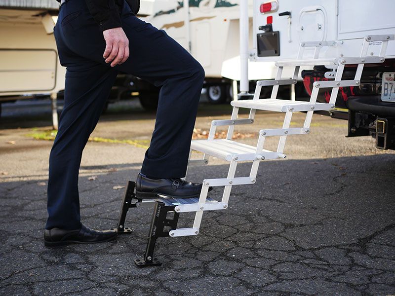 SMARTSTEP GlowStep Stow N? Go truck camper steps are specifically designed to be easily stowed and locked during transit. The camper steps are manufactured to help you avoid storing camper steps inside your RV and to eliminate the hassle of detaching steps during travel. The Stow N? Go is the perfect option for folding camper steps and step storage. They come standard with a storage bracket, GlowStep entry system and All Terrain Landing Gear to accommodate any type of terrain.