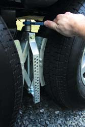 Prevent tandem-tire shift using just one piece of equipment - Eaz-Lift's Premium Metal Wheel Stop. Zinc-plated for corrosion resistance, has raised ribs on the contact surface for increased traction which helps prevent tire shift/slippage between tandem tires spaced from 3-10 inches apart. It also includes a comfort-grip ratchet wrench for easy installation and a lock to keep it secure.