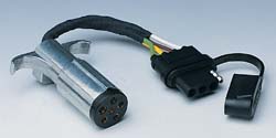 Prewired vehicle to trailer wiring adapter adapts a 6-way round to 4-wire flat adapter. Priced each.