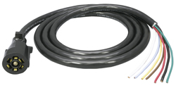 Plastic trailer connector molded to heavy-duty 7-way cable. Self-cleaning contacts. Black and white-10 gauge, blue-12 gauge, brown-red-green-yellow-14 gauge. Use with thermoplastic or metal 7-way car end connectors. Includes 8' cable.