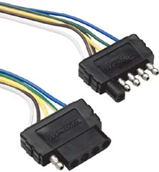 Five way flat connector with a 60' loop includes a 5th circuit for back-up lights, surge brake lockouts or other low amp 12 volt
