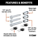 Includes two 1/2" diameter locks #23501 for tow bar arms and one 5/8" diameter lock #23528 for RV receiver