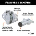 Splices into existing wiring to provide connections for both vehicle and trailer
