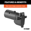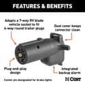 Adapts a 7-way RV blade vehicle socket to fit 6-way round trailer plugs