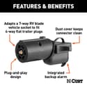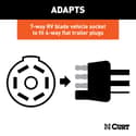 Adapts a 7-way RV blade vehicle socket to fit 4-way flat trailer plugs