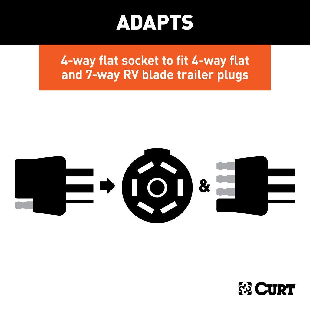 Adapts a 4-way flat socket to fit 4-way flat and 7-way RV blade trailer plugs