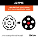 Adapts a 7-way RV blade vehicle socket to fit 6-way round trailer plugs