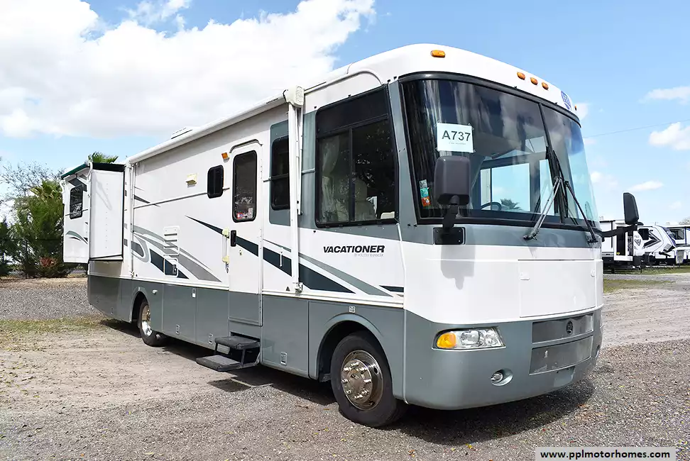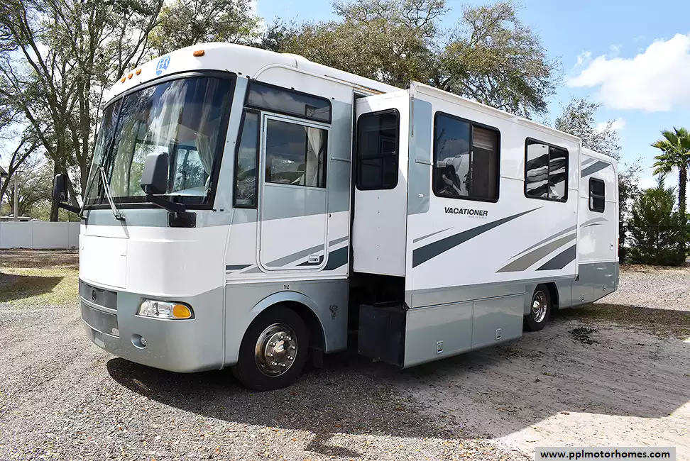 This 2002 Holiday Rambler Vacationer 32PBD has a V8 Chevy Engine On a Workhorse Chassis, 2 Slide-outs, Onan Generator, 2 Non-Ducted Air Conditioners, Levelers, Double Door Gas/110v Norcold Refrigerator, Main/Window/Slide/Door Awnings, Backup Camera, TV, Convection Microwave, 3 Burner Range