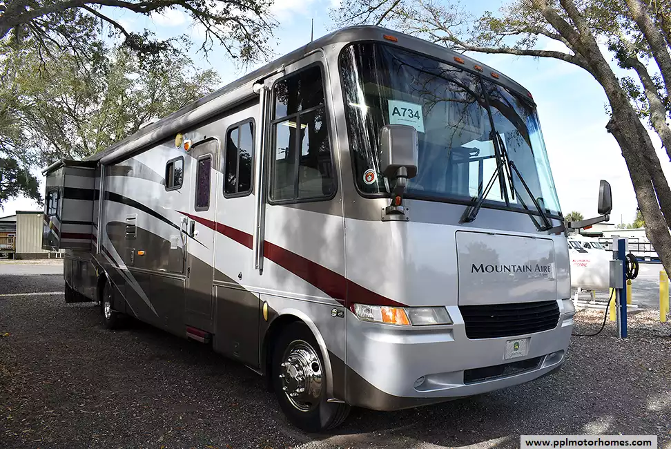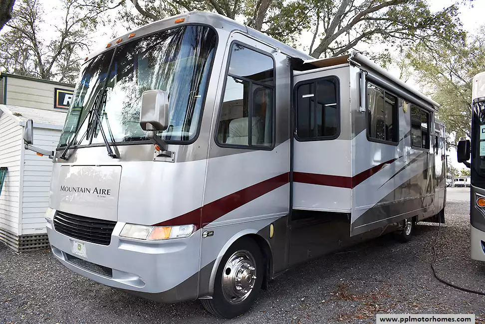 This 2002 Mountain Aire by Newmar 3778 has a 8.1 V8 Chevy Engine On a Workhorse Chassis, 2 Slide-outs, Onan Gas Generator, 2 Ducted Air Conditioners, Levelers, Double Door 110v Refrigerator, Automatic Main Awning And Window/Slide Awnings, Washer/Dryer, Backup Camera, TV, Outside Shower, Convection Microwave, 3 Burner Range