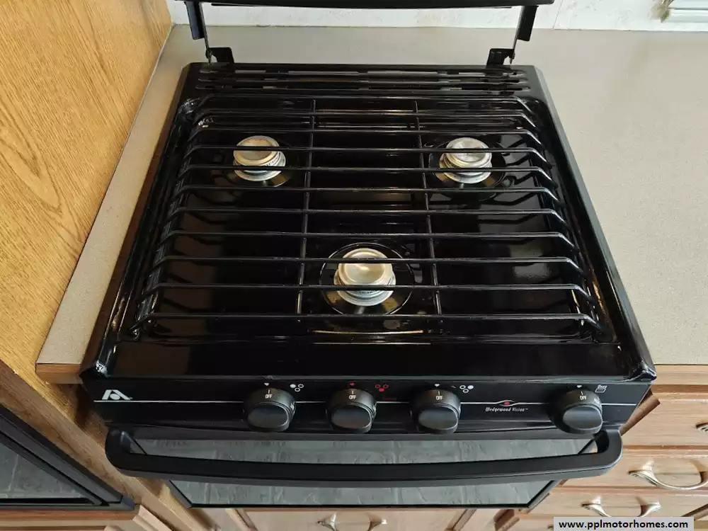 The 2003 Four Winds Hurricane 30Q has a floor plan designed for a spacious feel without slide-outs. The general layout includes a front living area, a central kitchen and bathroom, and a rear master bedroom. A private rear bedroom featuring a walk-around full size bed, large closet and dresser space. The bathroom is a single, large area, often described as having a large vanity, and includes a shower, toilet, and sink. Situated in the mid-section, featuring a double-door refrigerator, microwave, sink, and cooktop. A jackknife sofa and a convertible dinette provide for additional sleeping areas.