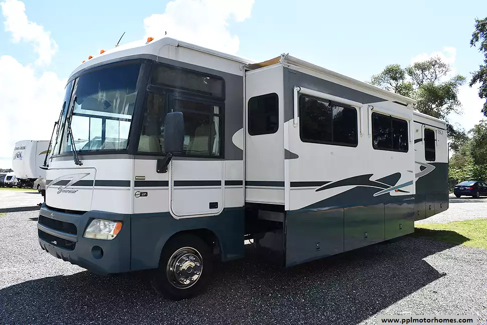 The 2003 Itasca Suncruiser 35U is a well-designed Class A motorhome offering comfort and convenience for extended travels. Built on a reliable Workhorse chassis, it features a spacious 35-foot floor plan with two slide-outs, expanding the living and bedroom areas for added comfort. Inside, you'll find a fully-equipped kitchen, a cozy living area with a sofa and dinette, and a private rear bedroom with ample storage. This model is ideal for those seeking a dependable RV for both weekend getaways and longer adventures.