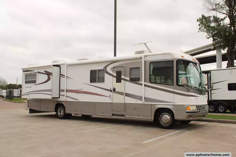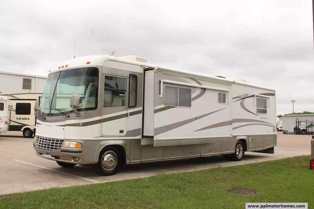 This 2003 Firenza 35-L is designed to provide a luxurious and spacious living experience on the road.This model offers a combination of comfort, convenience, and functionality, making it suitable for long-distance travel and extended stays.Comforts Include...V10 Ford Engine On a Ford Chassis, 2 Slide-outs, Onan Gas Generator, 2 Ducted Air Conditioners, Levelers, Double Door Gas/110v Dometic Refrigerator, Automatic Main Awning And Window/Slide Awnings, Backup Camera, 2 TVs, DVD Player, Outside Shower, Convection Microwave,and 3 Burner Range.With its thoughtful layout,quality amenities,and durable construction, this model promises a memorable and enjoyable journey on the open road.