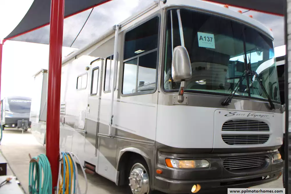 This 2004 Gulf Stream Sun Voyager 8378 has a 8.1l V-8 Chevy Engine On a Workhorse Chassis, 3 Slide-outs, Onan Gas Generator, 1 Non-Ducted And 1 Ducted Air Conditioner, Levelers, Double Door Gas/110v Dometic Refrigerator, Main/Slide Awnings, Backup Camera, Satellite Dish, 2 TVs, DVD Player, Outside Shower, Microwave, 3 Burner Range, Oven