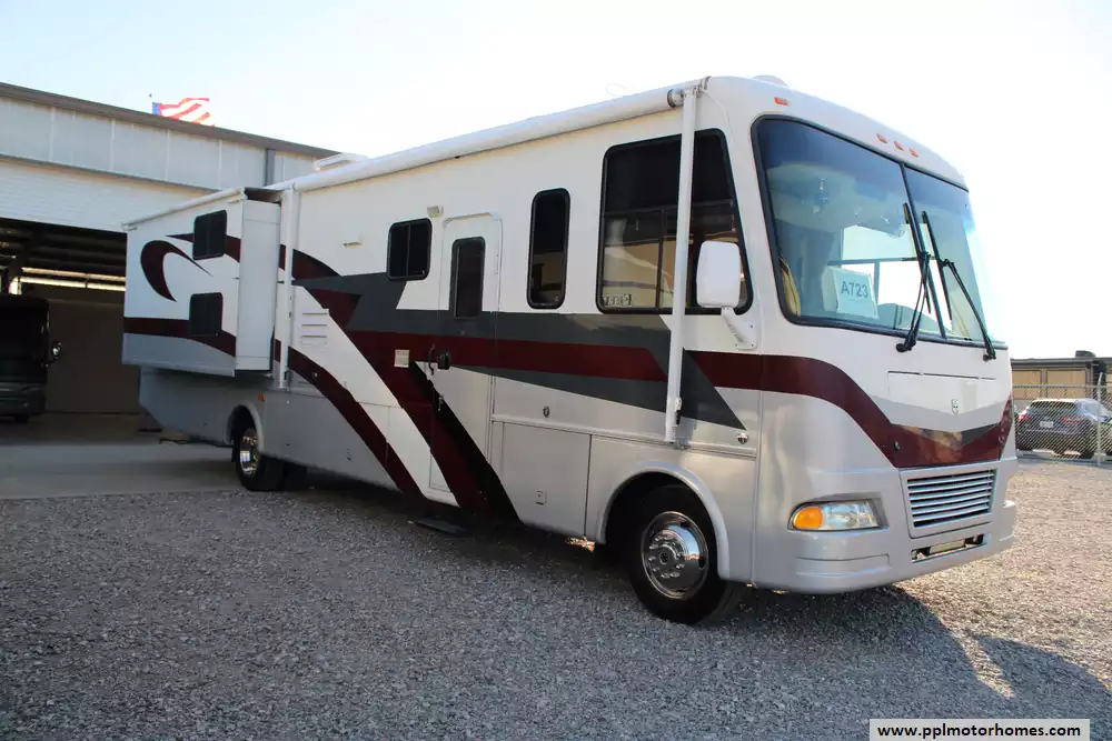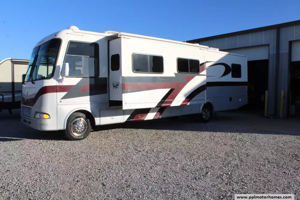 This 2006 Damon Daybreak 3276 has a V-10 Ford Engine On a Ford Chassis, 2 Slide-outs, Onan Gas Generator, 2 Ducted Air Conditioners, Levelers, Double Door Gas/110v/12v Dometic Refrigerator, Main Awning, Backup Camera, 3 TVs, Microwave, 3 Burner Range, Oven