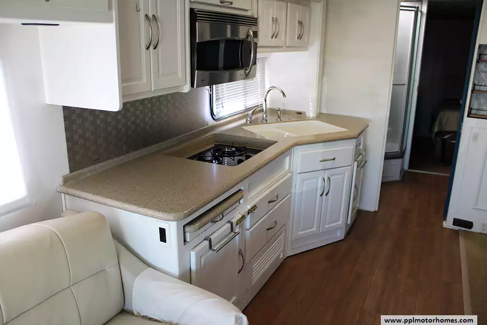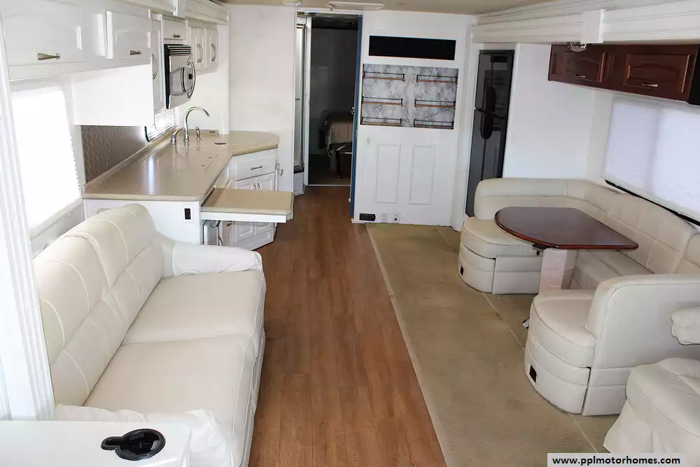 Inside, you'll find a warm residential layout that feels open and inviting. This coach sleeps up to 6 people comfortably thanks to its rear queen bed, convertible sofa sleeper, and convertible dinette -- perfect for couples who want extra room or families who need flexible sleeping space. Large windows, solid cabinetry, solid-surface counters, and a roomy bathroom give it the upscale feeling buyers love. Dual A/Cs, 50-amp service, plenty of storage, and generous tank sizes make long trips or extended stays easy and enjoyable.
