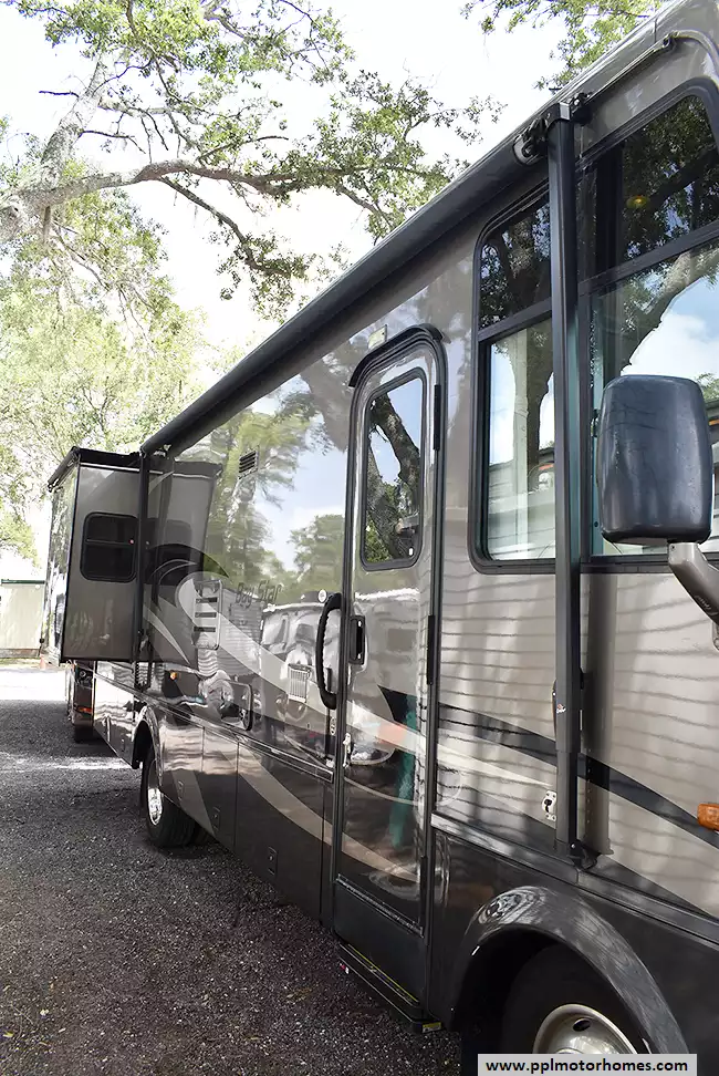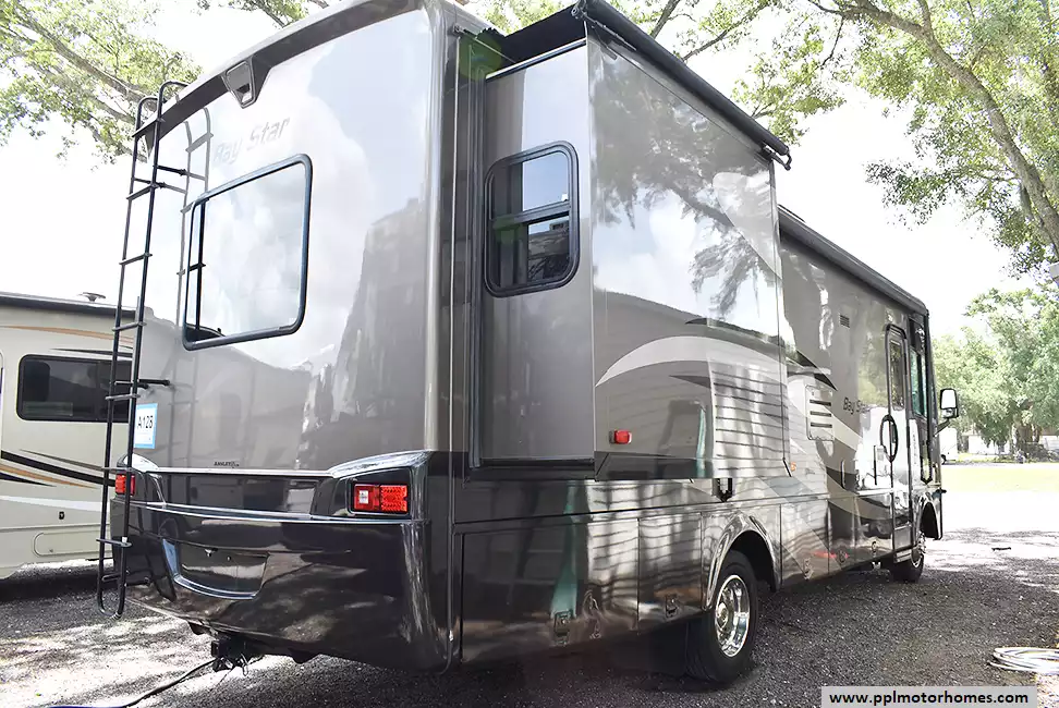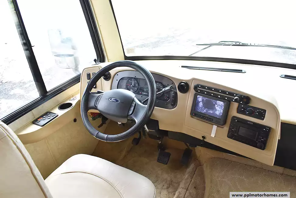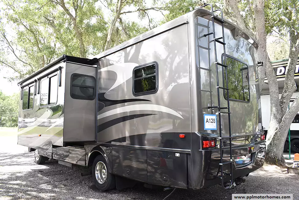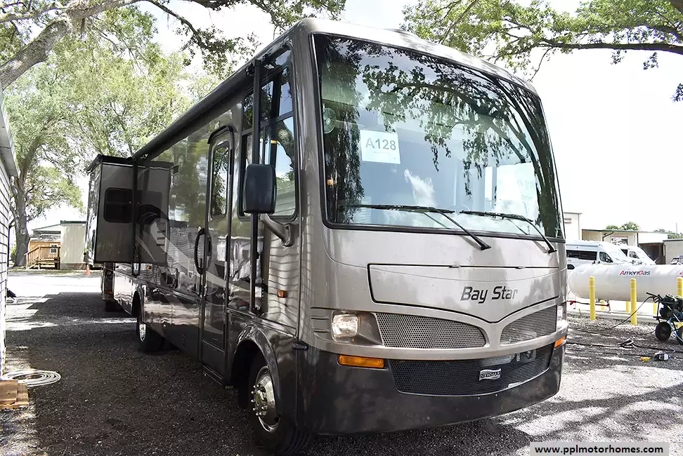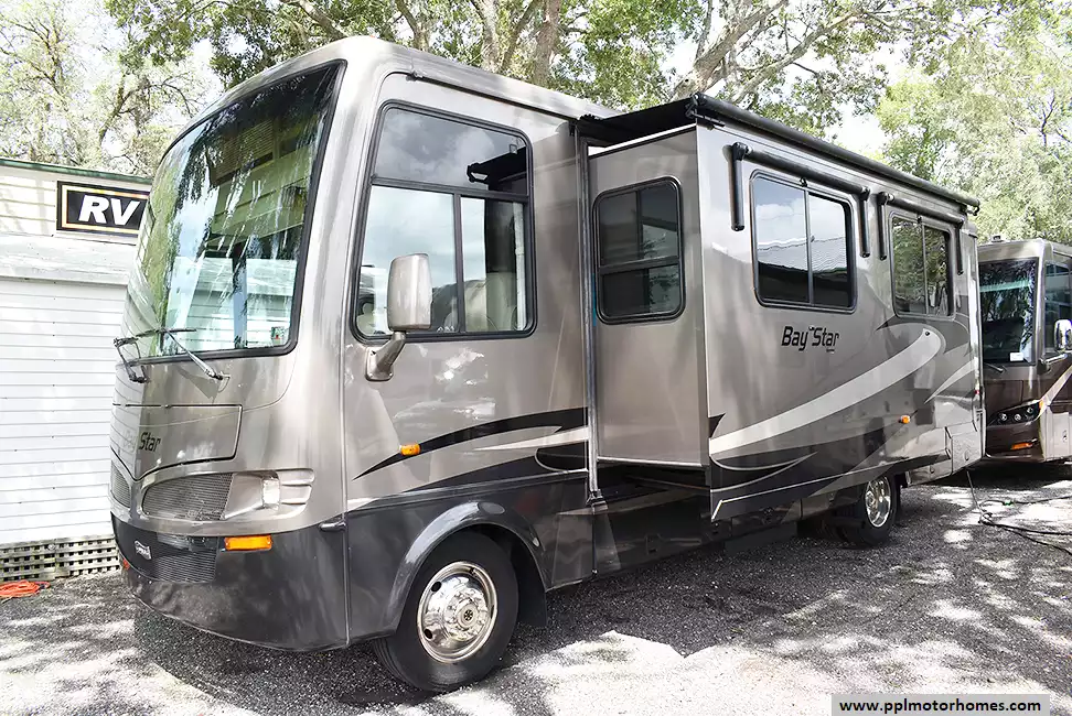 This 2010 Bay Star 2901 has a V10 Ford Engine On a Ford Chassis, 2 Slide-outs, Onan Gas Generator, 2 Ducted Air Conditioners, Levelers, Double Door Gas/110v Norcold Refrigerator, Automatic Main Awning And Slide Awning, Backup Camera, Solar Panel, Satellite Receiver, 2 TVs, Outside Shower, Microwave, 3 Burner Range, Oven