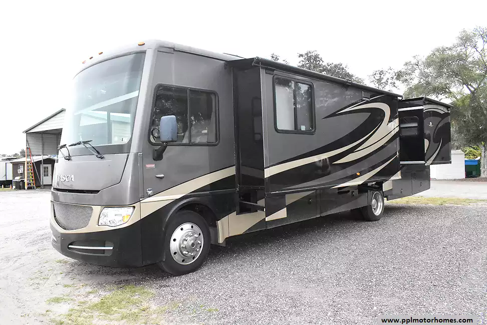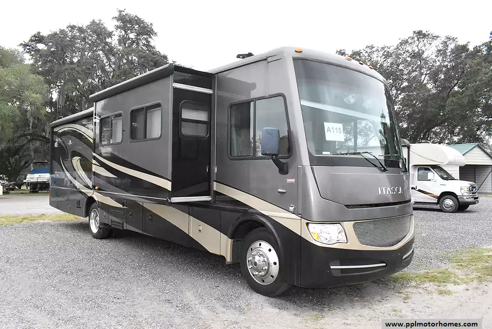 This 2013 Itasca Sunova 35G is a Class A motorhome celebrated for its spacious and well-designed layout. Built on a Ford F53 chassis, it promises a stable and smooth driving experience. With multiple slide-outs, it creates a roomy living area with a fully-equipped kitchen, a comfortable lounge, and a private master bedroom with a queen-sized bed. The bathroom is well-appointed with modern fixtures. Ideal for those who prioritize comfort and style, the Itasca Sunova 35G provides a luxurious and functional home on wheels for unforgettable journeys on the road, combining modern living with convenience and sophistication.