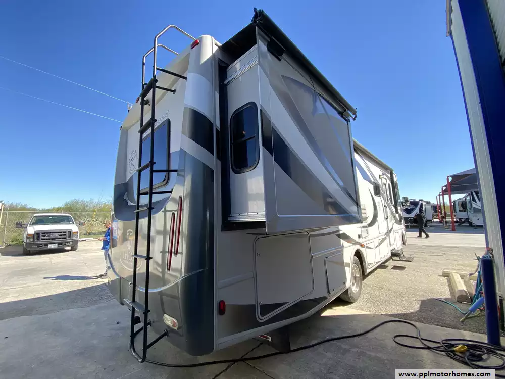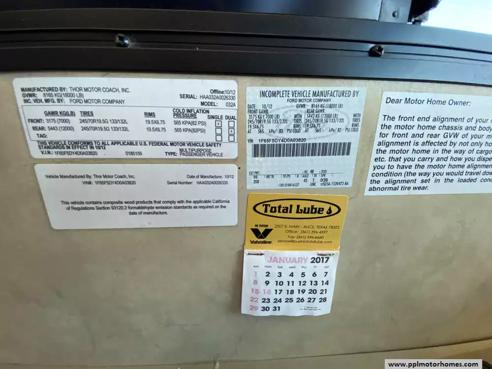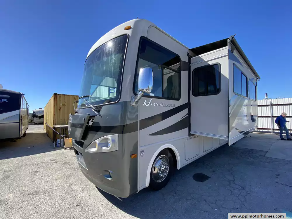 This 2013 Hurricane 32A has a 6.8l V-10 Ford Engine On a Ford Chassis, 2 Slide-outs, Onan Gas Generator, 2 Ducted Air Conditioners, Levelers, Double Door Gas/110v Norcold Refrigerator, Automatic Main Awning And Slide Awning, Backup Camera, Heated Tanks, Satellite Receiver, 2 TVs, Outside Shower, Microwave, 3 Burner Range, Oven