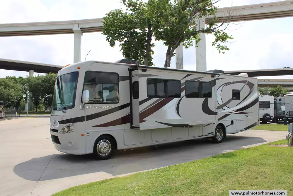 This 2013 Hurricane 34E is a Class A gas-powered motorhome designed to offer residential comfort and practical features for travelers.Features Include...V10 Ford Engine On a Ford Chassis, 2 Slide-outs, Onan Gas Generator, 2 Ducted Air Conditioners, Levelers, Double Door Gas/110v Norcold Refrigerator, Automatic Main Awning And Slide Awning, Backup Camera, 2 TVs, Outside Shower, Microwave, 3 Burner Range, and Oven. Theater seat has message and heating. The 2013 Thor Hurricane 34E stands out for its spacious layout, offering both a full and a half bathroom, making it convenient for families or groups.
