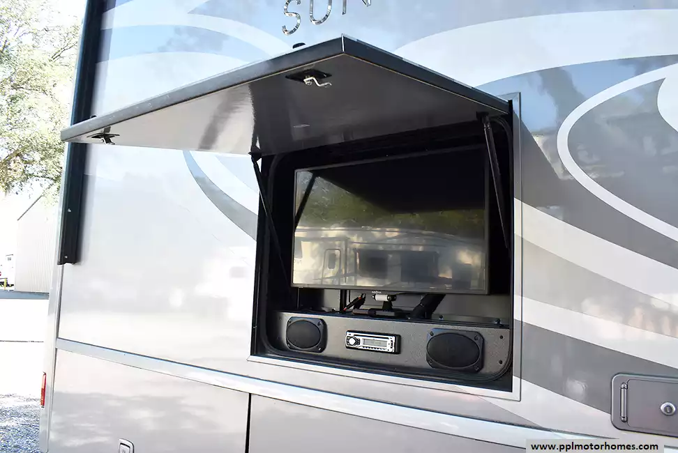 Outdoor entertainment center - perfect for tailgating or relaxing under the awningScreen room enclosure included - enjoy bug-free outdoor living