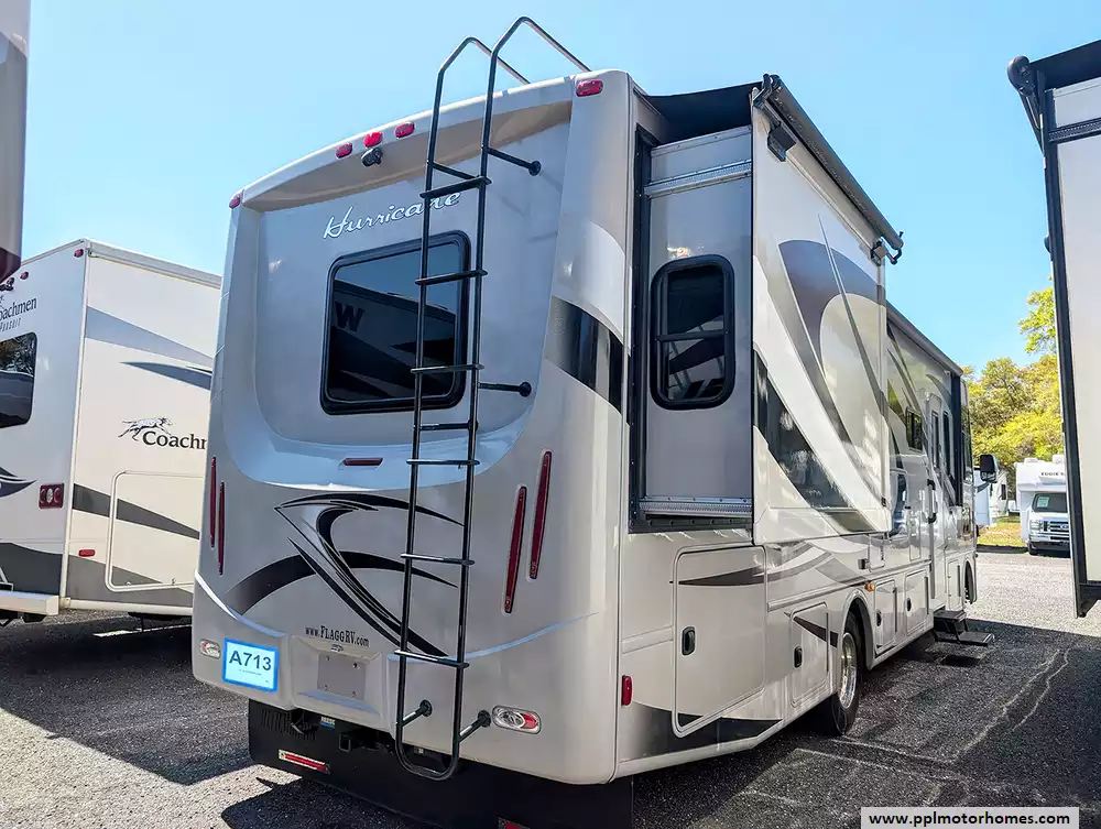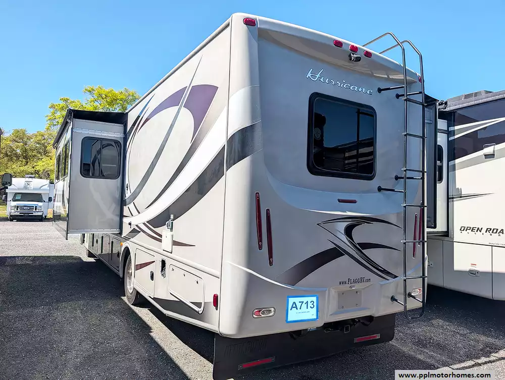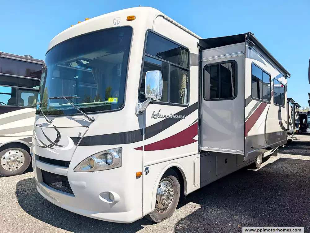 Experience the perfect blend of maneuverability and spacious luxury with this 2014 Hurricane 32A. At 33 feet in length, this Class A motorhome occupies the industry sweet spot, providing enough room for the whole family while remaining easy to drive and park in most campgrounds. Built on the dependable Ford chassis with a powerful V10 engine, it features premium fiberglass body construction and a highly desirable fiberglass roof for long-term durability. Setting up camp is completely effortless thanks to the integrated levelers and an automatic main awning. Whether you are navigating backroads with the integrated backup camera or utilizing the Onan gas generator for a remote getaway, this coach is engineered to deliver a reliable and confident travel experience.