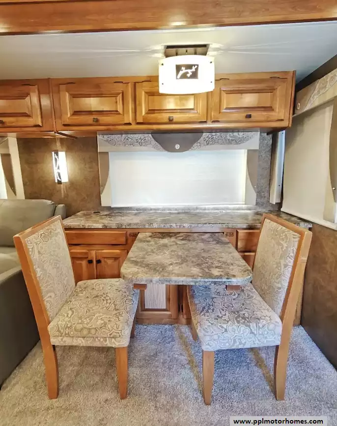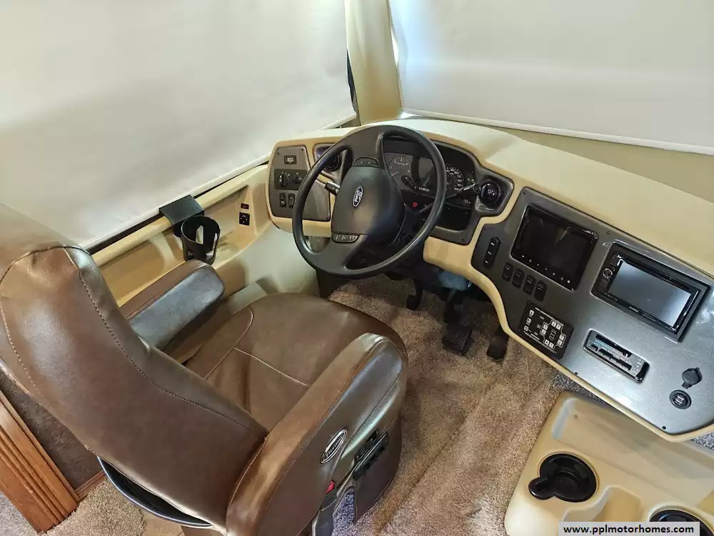 The 2014 Tiffin Allegro 36LA is a Class A gas motorhome known for its bath-and-a-half floor plan and quality construction. It is built on a Ford chassis and powered by a Ford V10 engine. The front features swivel captain's chairs. The driver's side slide-out contains a table with chairs, a jackknife sofa, oversized chairs and overhead cabinets. This faces an entertainment center which houses a TV and the fireplace.