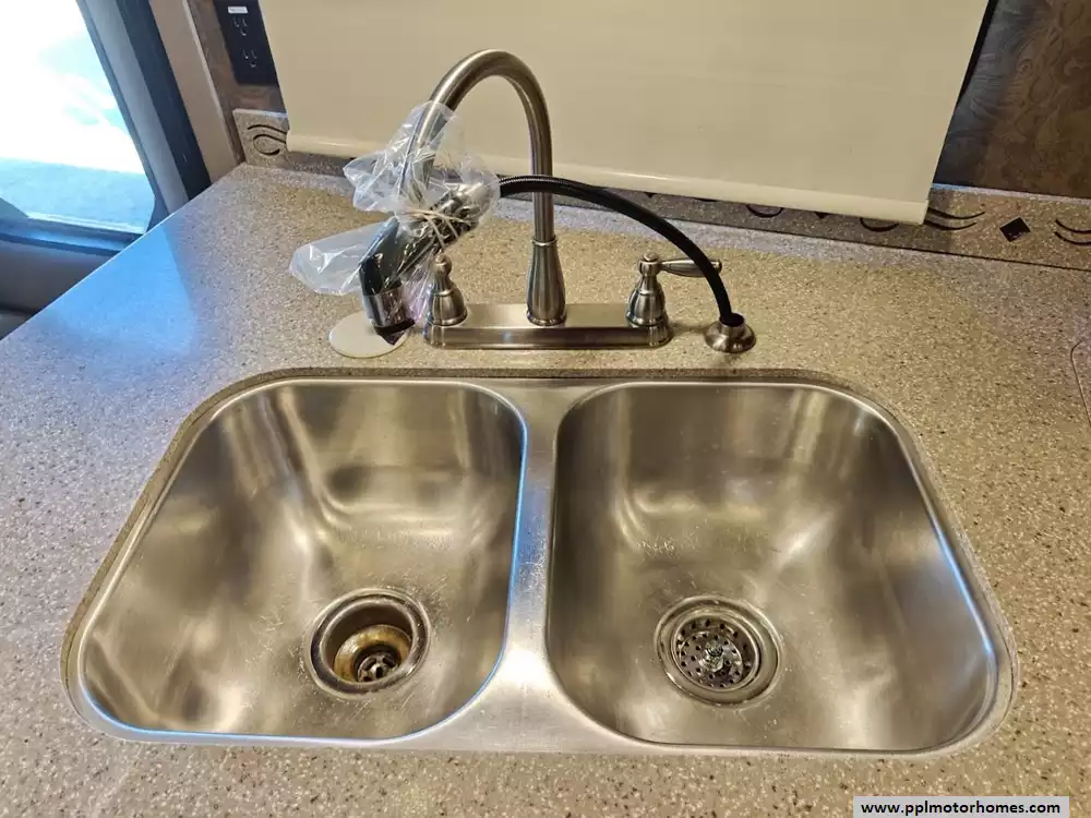 The kitchen is on the passenger's side. It includes a double sink, cabinets, a three-burner range, a convection microwave, a residential refrigerator, and a pantry.