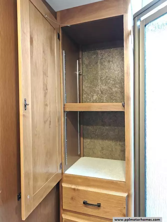 The master bedroom has a queen-size bed in a slide-out with nightstands and overhead cabinets. The opposite wall has a wardrobe with drawers, a vanity with a TV, and overhead cabinets. The full master bathroom is at the rear. It includes a corner vanity and sink, a toilet, a shower , a linen closet and one piece combo washer/dryer.