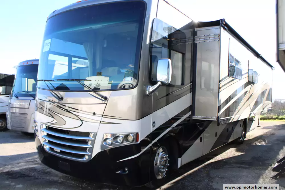 This 2015 Miramar 34.2 has a V-10 6.8l Ford Engine On a Ford Chassis, 1 Slide-out, Onan Gas Generator, 2 Ducted Air Conditioners, Levelers, Double Door Residential Whirlpool Refrigerator, In-Fridge Ice Maker, Automatic Main Awning And Slide Awning, Backup Camera, Outside Entertainment System with TV, 2 TVs, Outside Shower, Microwave, 3 Burner Range, Oven