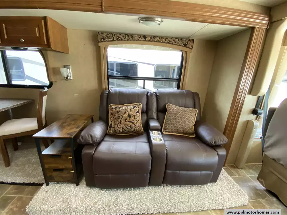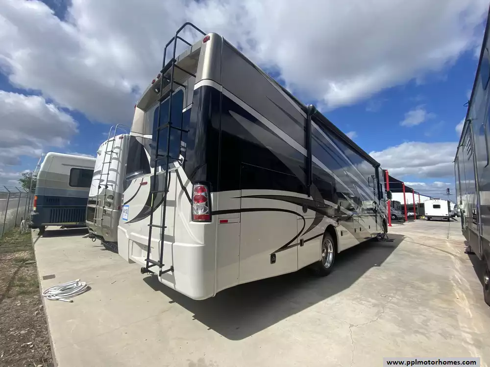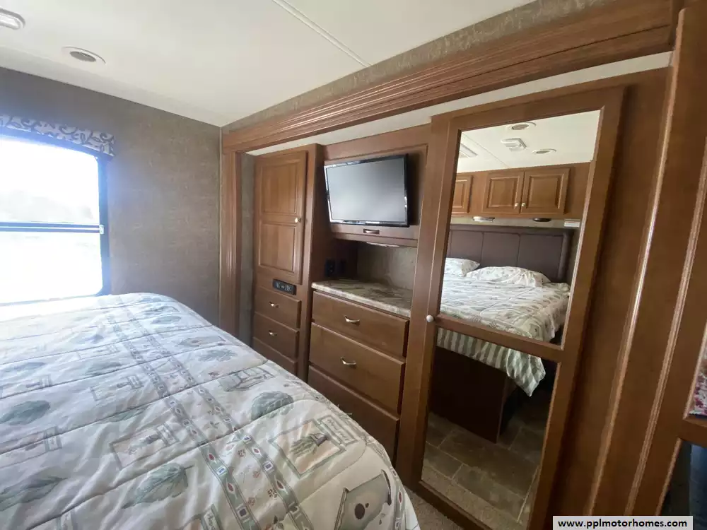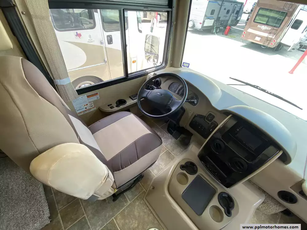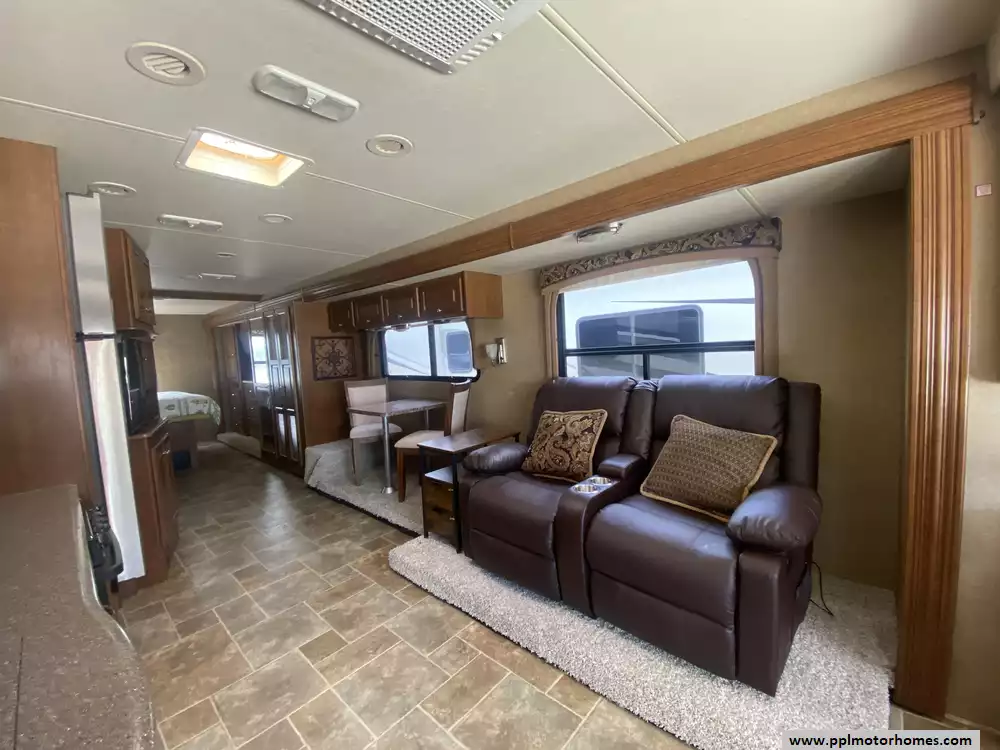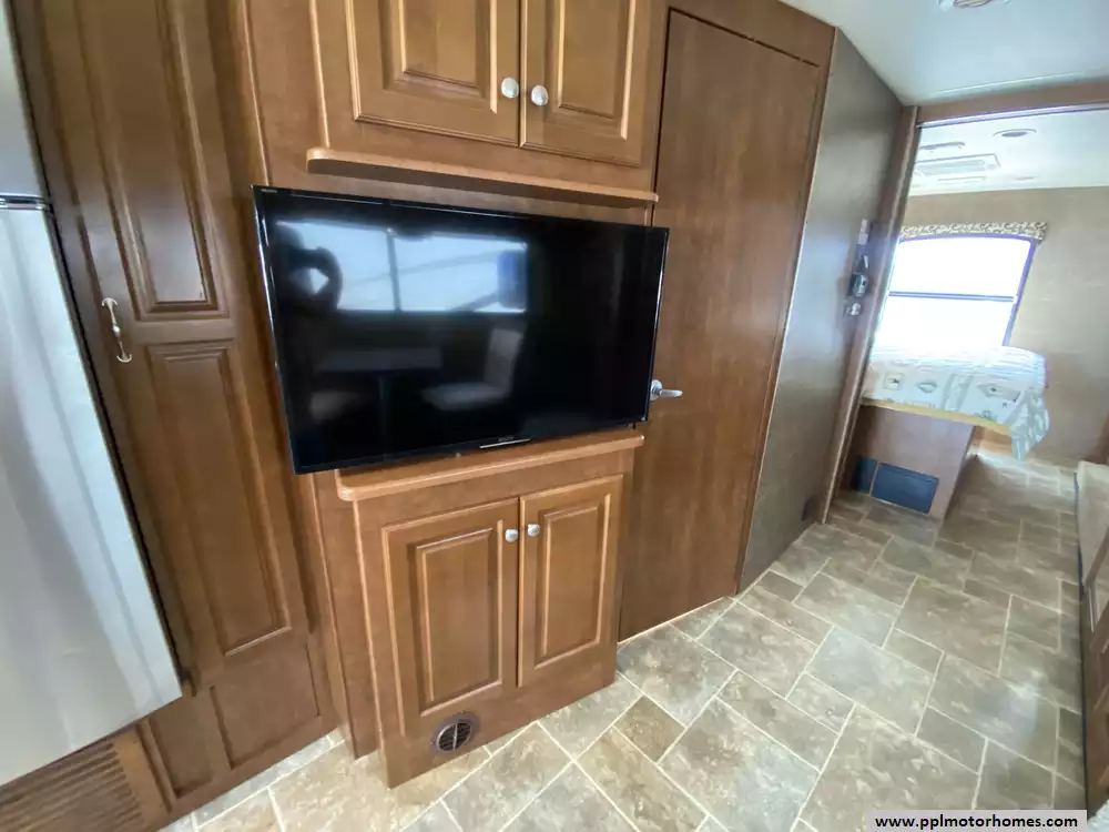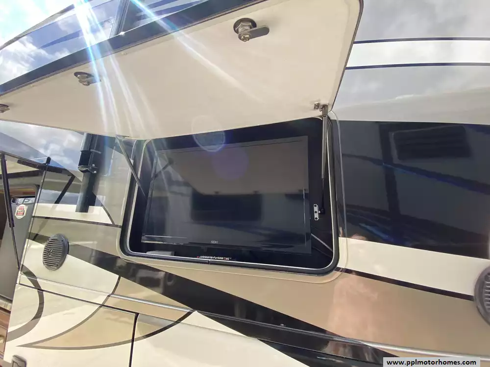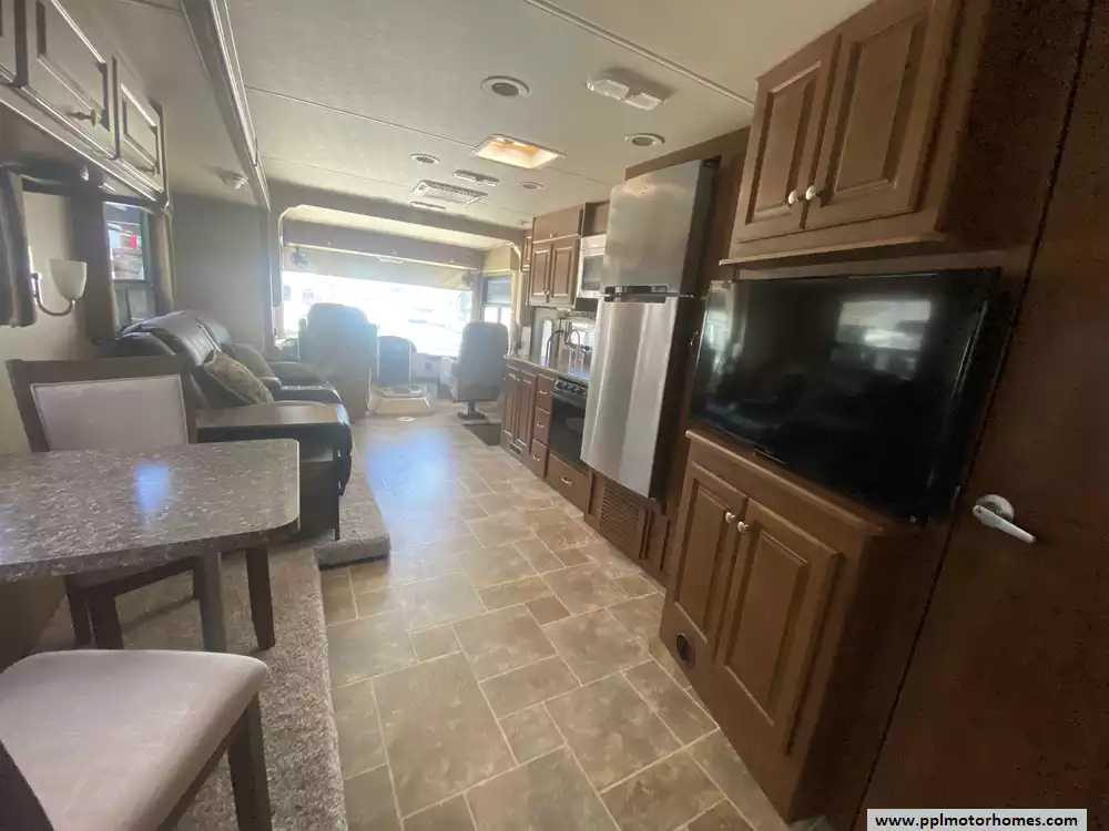 This 2015 Miramar 34.2 has a 6.8l V-10 Ford Engine On a Ford Chassis, 1 Slide-out, Onan Gas Generator, 2 Ducted Air Conditioners, Residential 110v Whirlpool Refrigerator, In-Fridge Ice Maker, Automatic Main Awning, Backup Camera, Outside Entertainment System, 2 TVs, DVD Player, Outdoor Kitchen, Outside Shower, Microwave, 3 Burner Range, Oven. Recliners hae remote heating and massage, Pivot mount on TV, New Batteries.
