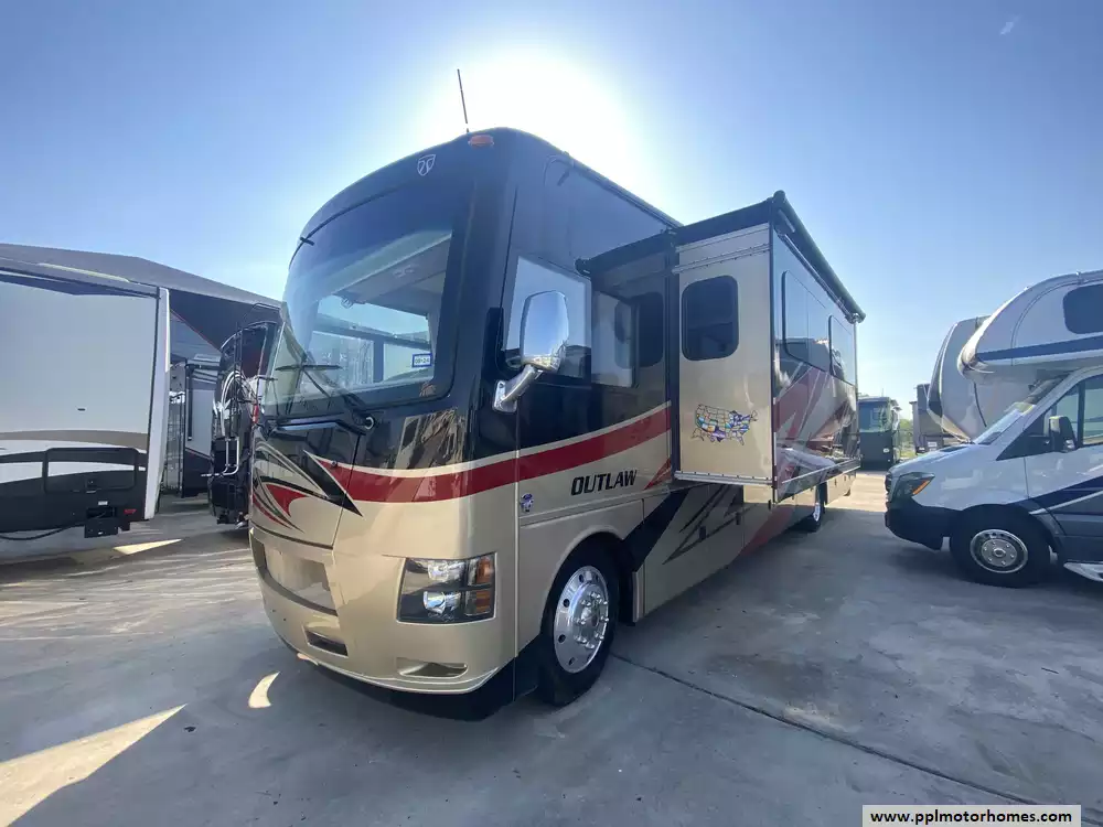 This 2015 Outlaw 37LS has a V-10 6.8l Ford Engine On a Ford Chassis, 1 Slide-out, Onan Gas Generator, 2 Ducted Air Conditioners, Levelers, Double Door Gas/110v Norcold Refrigerator, Automatic Main Awning And Slide Awning, Backup Camera, GPS System, Solar Panel and Inverter, Outside Entertainment System with TV, 2 TVs, Outside Shower, Microwave, 3 Burner Range, Oven