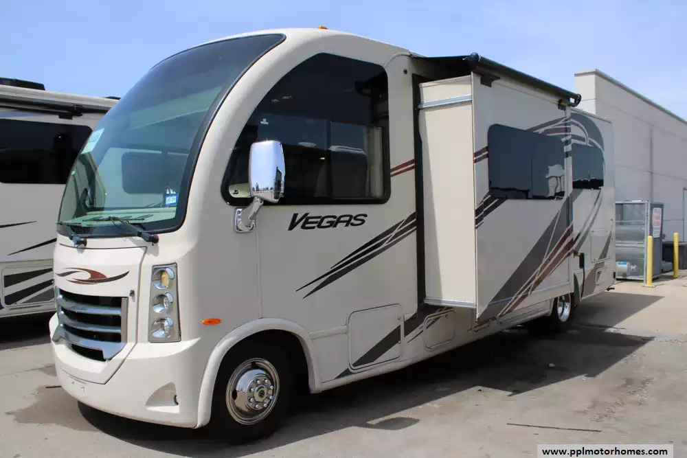 The 2015 Thor Motor Coach Vegas 24.1 is a compact yet well-appointed Class A gas motorhome measuring about 25-ft 6-in long, built on a Ford E-350 chassis with a Triton V10 engine delivering roughly 305 hp (420 ft-lb torque) and five-speed TorqShift automatic transmission. It features one power slide-out to expand the main living space, a power patio awning with integrated LED lighting, exterior entertainment center, pass-through storage, and exterior shower. Inside, the cabin accommodates up to five sleepers, including two rear twin beds (which convert to a king-sized bed), a drop-down overhead bunk, and a sofa-bed in the slide-out, plus a pedestal dining table and swivel captain's chairs with a stow-away coffee table. The center full bath offers a shower, toilet, and sink (with a bi-fold door for privacy), while the kitchen kitchen includes a 3-burner cooktop, mid-size refrigerator, convection microwave, stainless sink, and flip-up counter extension. Additional perks include ducted roof A/C, generator, backup/side-camera system, leatherette flooring and furnishings, and generous storage, making it ideal for couples or small families who want maneuverability and comfort in a modest footprint.