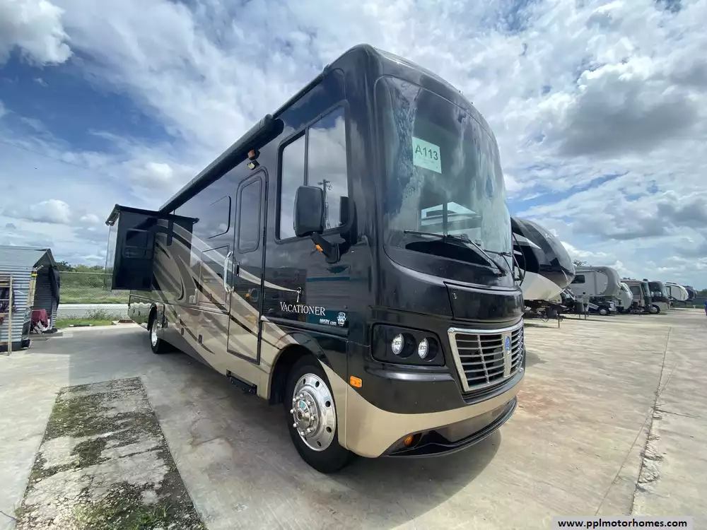 This 2016 Holiday Rambler Vacationer 35DK has a 6.8l V-10 Ford Engine On a Ford Chassis, 2 Slide-outs, Onan Gas Generator, 2 Ducted Air Conditioners, Levelers, Double Door Residential Frigidaire Refrigerator, In-Fridge Ice Maker, Automatic Main Awning And Slide Awning, Washer/Dryer, Backup Camera, Outside Entertainment System with TV, 2 TVs, DVD Player, Outside Shower, Fireplace, Convection Microwave, 2 Burner Range