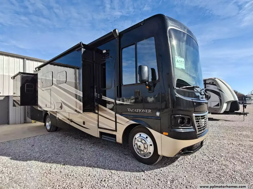 This 2016 Holiday Rambler Vacationer 36SB has a living area that features a 39" LED TV, LED lighting, an electric fireplace and an expandable L-sofa. The kitchen is equipped with solid surface countertops, a double-bowl stainless steel sink, a three-burner range with a microwave/convection oven, and a residential refrigerator. The bedroom has a queen sized bed with a large solid cherry wood wardrobe across from the bed. It also features a 24" TV. The bathroom has a fiberglass shower enclosure, which is topped with a skylight for additional light. A glass shower door with a rain-glass finish that adds a touch of style. The shower includes a metal shower head with an on/off switch, an adjustable sliding bar, a soap dish, and a matching dual-valve faucet for convenience. A hardwood medicine cabinet with a mirror is included for toiletries and other small items.Other features include sleeping for up to 6 people, 3 Slide-outs, Onan Gas Generator, 2 Ducted Air Conditioners, automatic Levelers, Automatic Main Awning, Backup Camera, Solar Panel, Outside Speakers, outside TV and Outside Shower.
