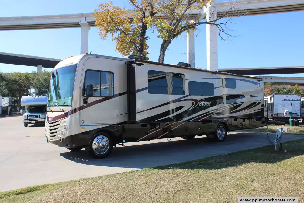 This 2017 Storm 36F is built for comfort and extended travel. Features Include...V10 Ford Engine On a Ford Chassis, 2 Slide-outs, Onan Gas Generator, 2 Ducted Air Conditioners, Levelers, Residential Refrigerator, In-Fridge Ice Maker, Automatic Main Awning And Slide/Door Awnings, Washer/Dryer, Backup Camera, Heated Tanks, Outside Entertainment System, 4 TVs, Satellite Radio, Outside Shower, Fireplace, Central Vacuum, Convection Microwave, 3 Burner Range, and Oven.