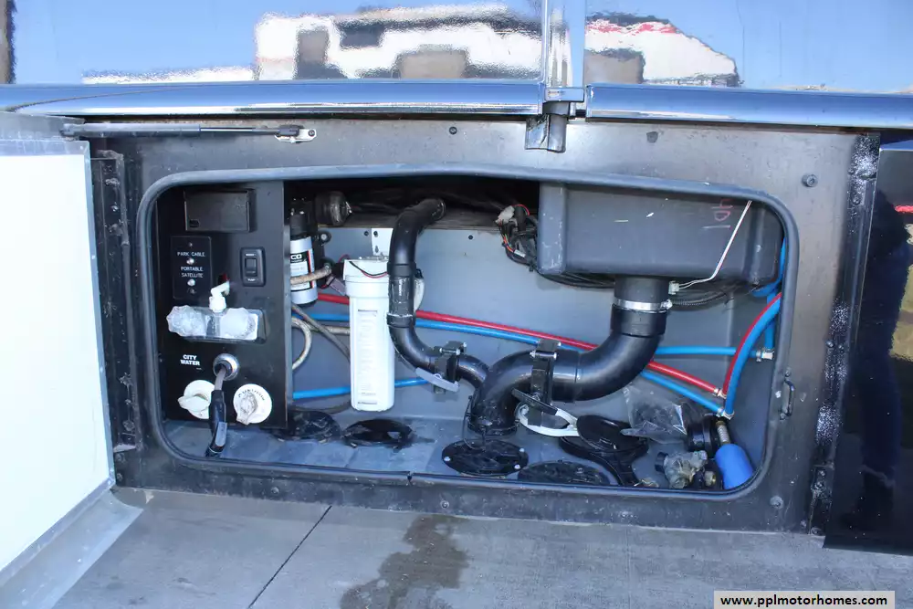 Specs: Length: 38.8 ft., Width: 8.5 ft., Height: 12 ft., Interior Height: 6.83 ft., Interior Width: 8 ft., Fuel Capacity: 80 gal., Total Fresh Water Tank Capacity: 60 gal., Total Gray Water Tank Capacity: 80 gal., Total Black Water Tank Capacity: 37 gal.