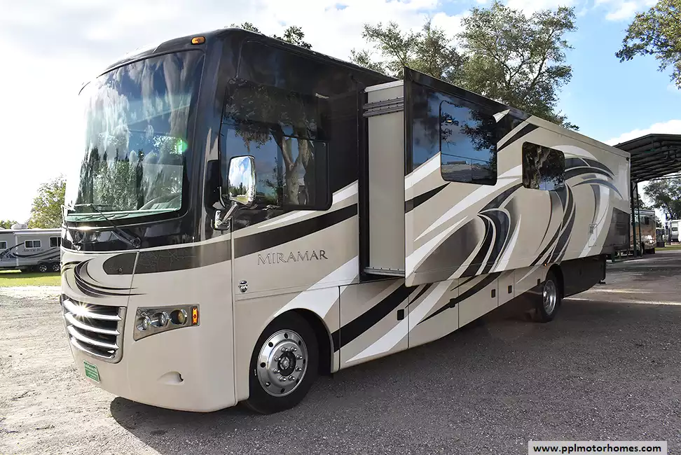 This 2017 Thor Miramar 34.2 is a Class A motorhome designed for luxury and comfort. Built on a Ford F53 chassis, it offers a stable and smooth driving experience. Inside, the layout includes multiple slide-outs, creating a spacious living area with a fully-equipped kitchen, elegant furnishings, and a cozy master bedroom with a queen-sized bed. The bathroom features modern amenities and a roomy shower. Ideal for travelers seeking both comfort and style, the Thor Miramar 34.2 provides an opulent and functional home on wheels for unforgettable journeys on the road, blending modern living with practicality and convenience.