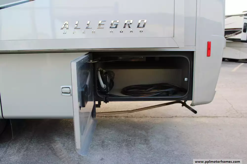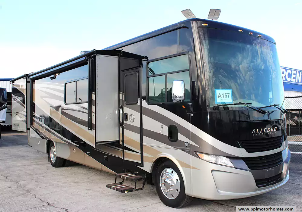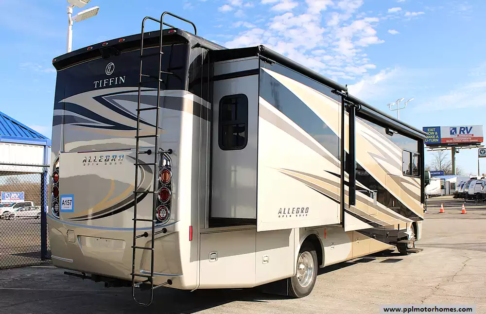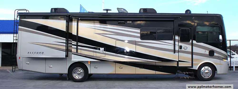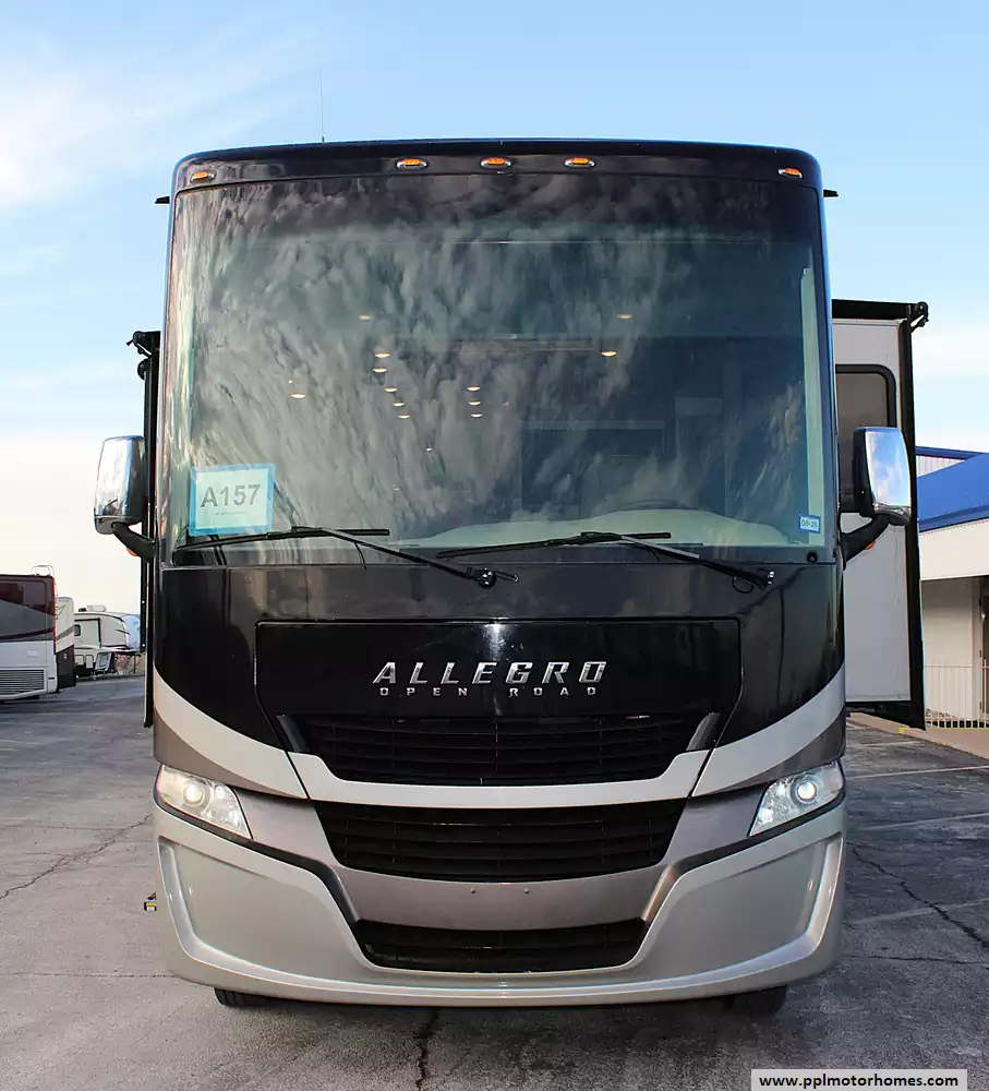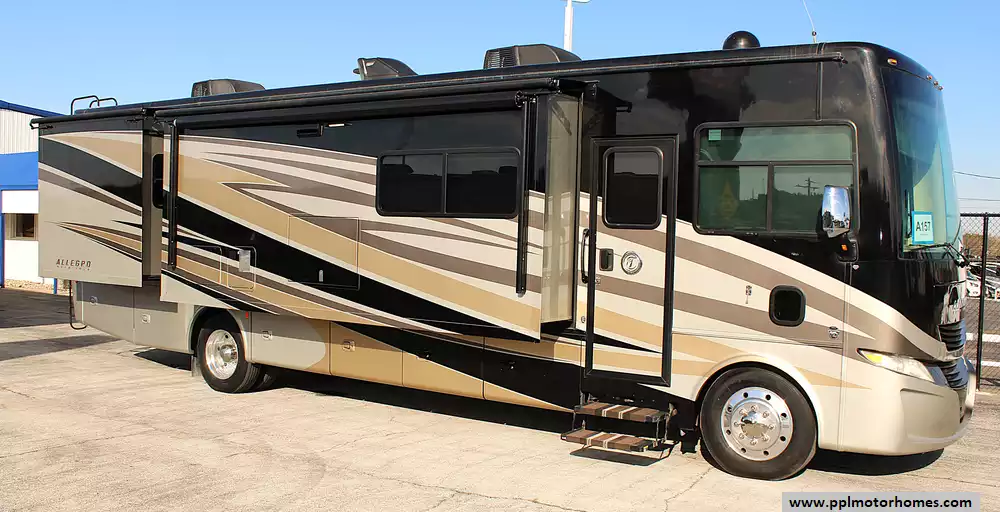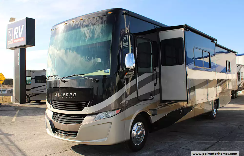 With a gross combined weight rating (GCWR) around 30,000 lbs and a hitch/tow capacity of about 5,000 lbs, this Allegro 34PA can tow a small car or trailer behind it, giving you the freedom to bring along extra gear or a toad vehicle for local travel at your destination. Always confirm specific towing limits on the coach's compliance label before loading. For its own travel, this full-size motorhome is self-propelled and doesn't require a tow vehicle for primary movement - making it a self-contained touring and camping solution