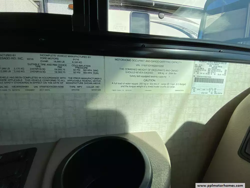 This 2017 Winnebago Vista 31BE has a V10 Ford Engine On a Ford Chassis, 1 Slide-out, Onan Gas Generator, 1 Ducted Air Conditioner, Levelers, Double Door Gas/110v Norcold Refrigerator, Automatic Main Awning, Backup Camera, Outside Entertainment System, 2 TVs, 2 DVD Players, Microwave, 3 Burner Range, Oven